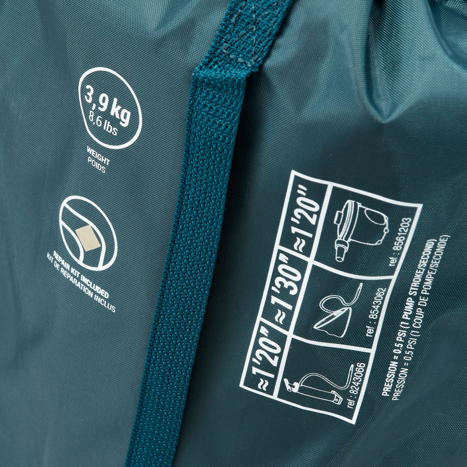 The ideal inflation for this kind of mattress is generally moderate (0.02 BAR or 0.3 PSI), which, when you are sitting on the mattress, allows you to feel the ground under you. Once you lie down, the mattress will fit around your body and therefore provide the best comfort. We recommend using a pump type: Quechua 5.2 L red (8243066) which is our most efficient and leading model.